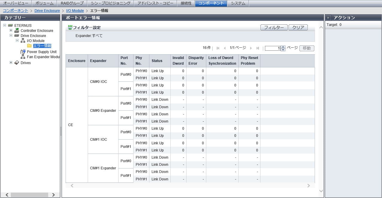 ポートを持つエンクロージャ(コントローラーエンクロージャ、ドライブエンクロージャ)が表示されます。 ETERNUS DX900 S5またはETERNUS DX8900 S4の場合 CE#x DE#yy そのほかのモデルの場合 CE DE#yy x:CE番号 yy:DE番号 |