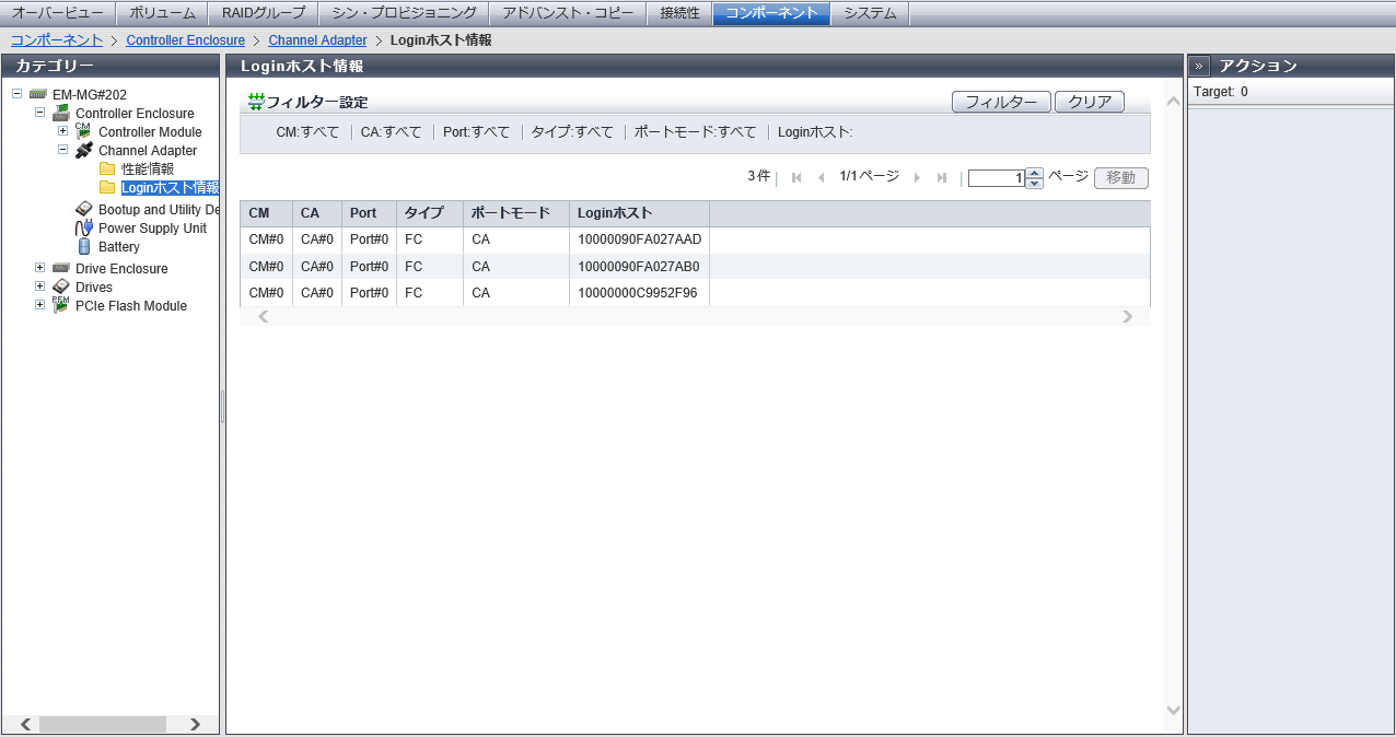 ポートにログインしているホスト情報が表示されます。 1ポートに複数のホストがログインしている場合、以下のようにホストごとに表示されます。