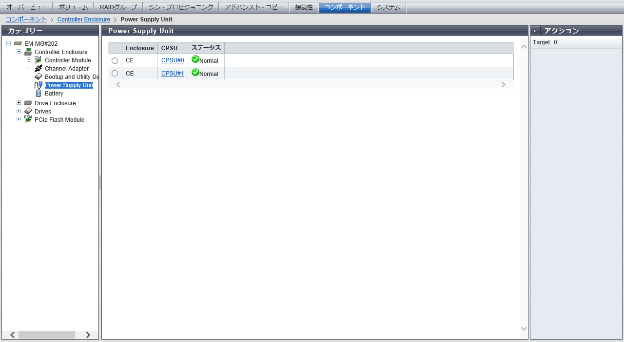 CE(Controller Enclosure)用の PSU(Power Supply Unit)の情報が表示されます。