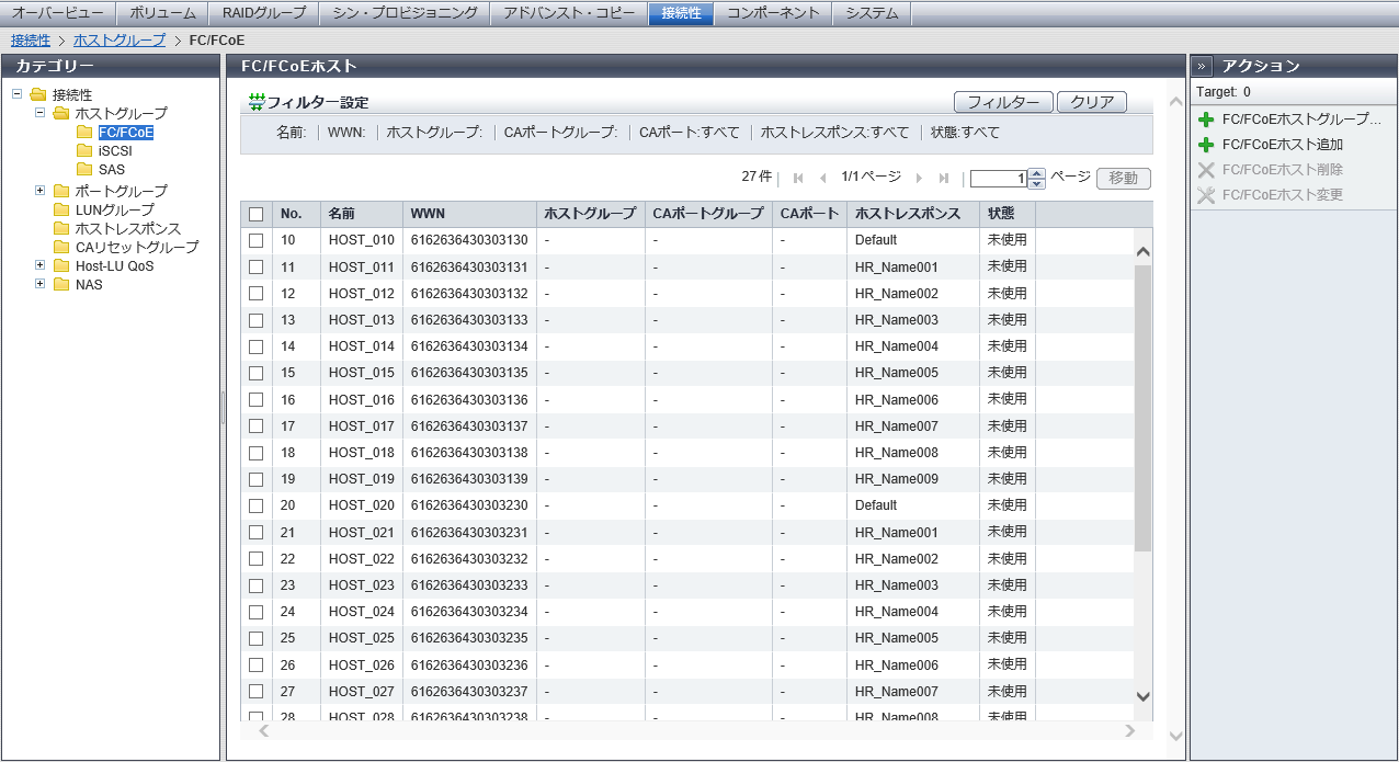 FCホストを ホストアフィニティ設定 で「使用中」か「未使用」かが表示されます。