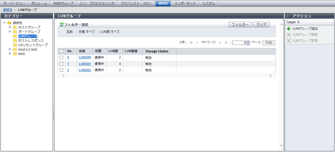 LUNグループを ホストアフィニティ設定 で「使用中」か「未使用」かが表示されます。