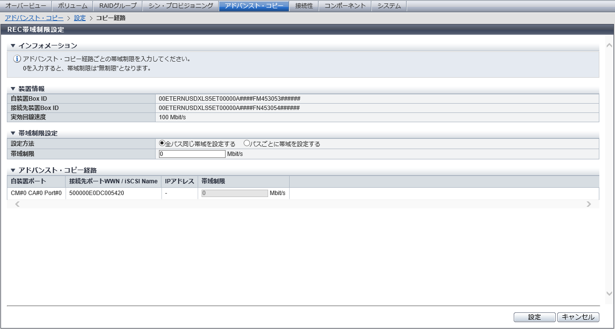 設定方法に「全パス同じ帯域を設定する」を選択した場合、帯域制限値を入力します。「0」を入力すると、帯域制限は「無制限」になります。 設定方法に「パスごとに帯域を設定する」を選択した場合、空白が表示されます。アドバンスト・コピー経路欄で経路ごとに帯域制限値を設定してください。 |