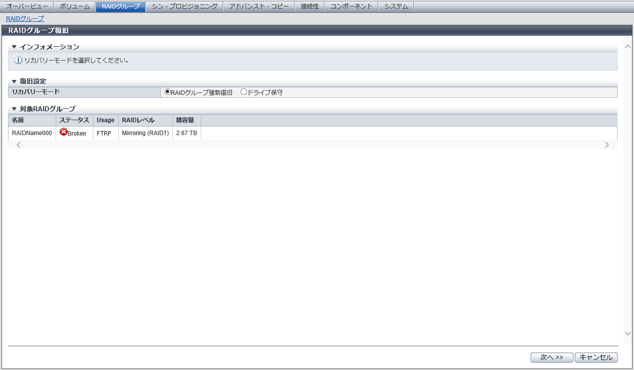 強制復旧では復旧できない場合に以下の操作を実行し、RAIDグループを復旧します。