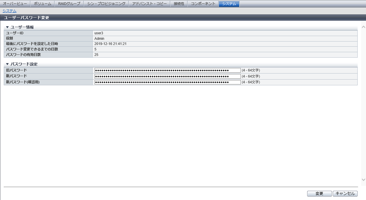 ユーザー情報の「最後にパスワードを設定した日時」に日時が表示された場合、そのユーザーアカウントは「パスワードのポリシー」が有効に設定されています。事前に「パスワードのポリシー」の設定内容を確認し、パスワードを変更してください。詳細は、「ユーザーポリシー設定」を参照してください。