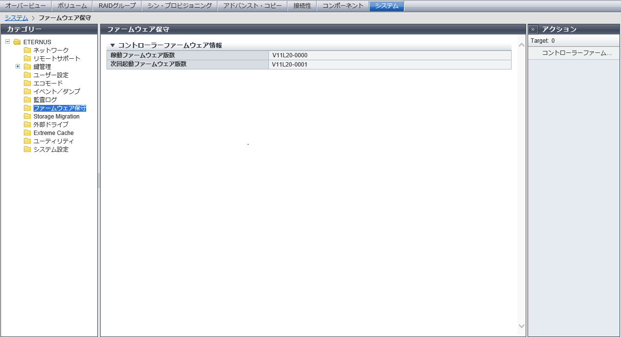 「コントローラーファームウェア適用」はアクション欄に表示されません。