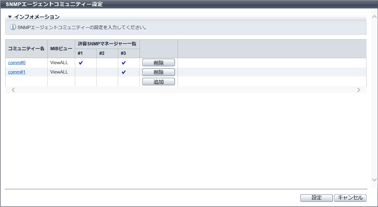 [ SNMPエージェントコミュニティー設定 ] 画面でコミュニティー情報を編集できます。