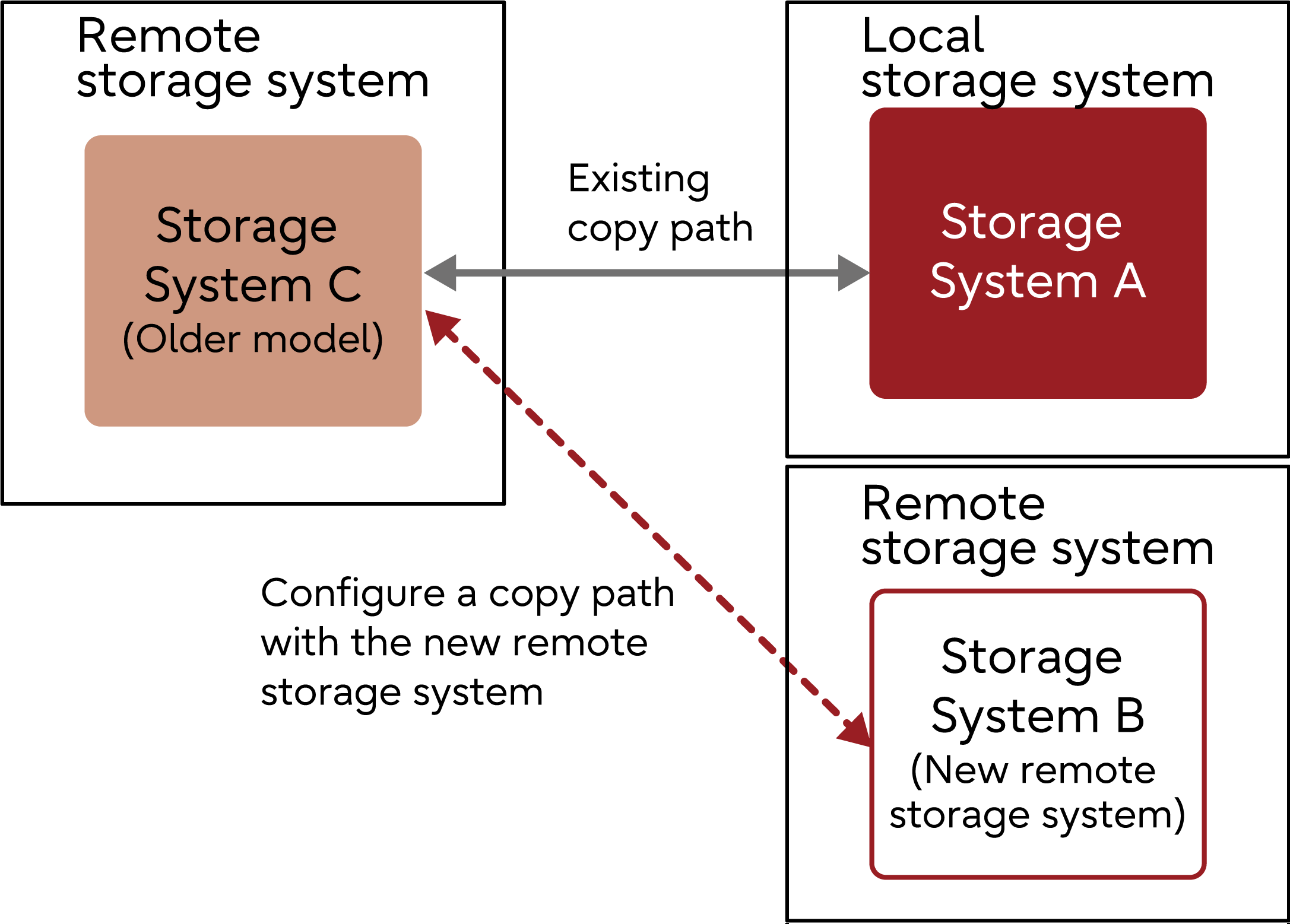 CautionIn this example, a new copy path is added between the local storage system (Storage System A) and Storage System C in a configuration where a copy path between the local storage system (Storage System A) and the older model (Storage System B) has already been established.