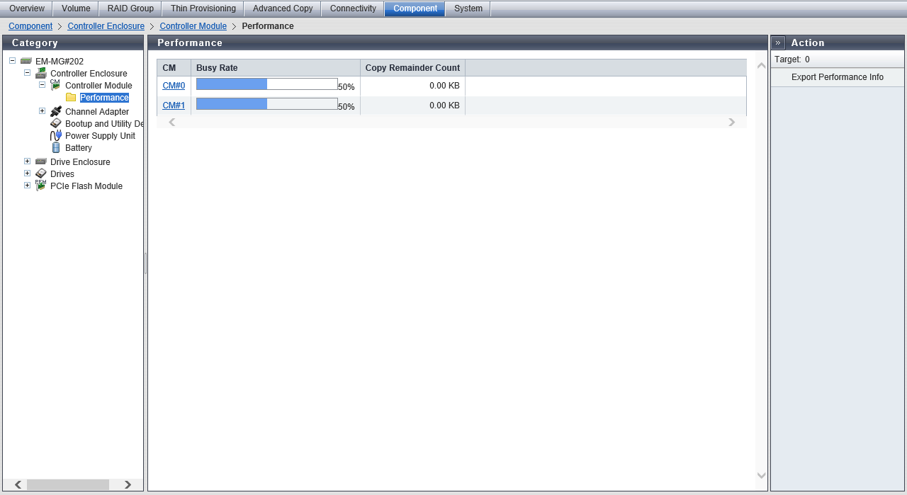 In this screen, performance information of the CM is displayed. When the performance monitoring function is stopped, "0" is displayed for the busy rate and the copy remainder count.