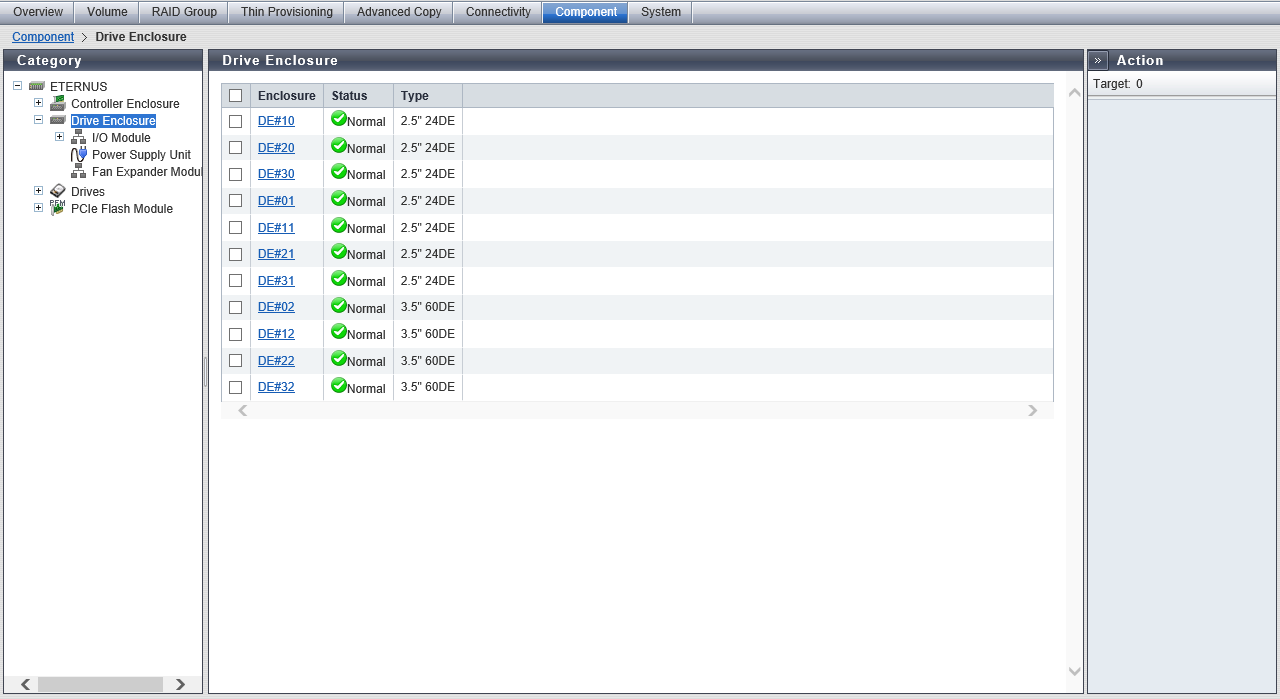 The DE number is displayed. Click this item to display the [Drive Enclosure Detail] Screen. DE#xx xx: DE number |