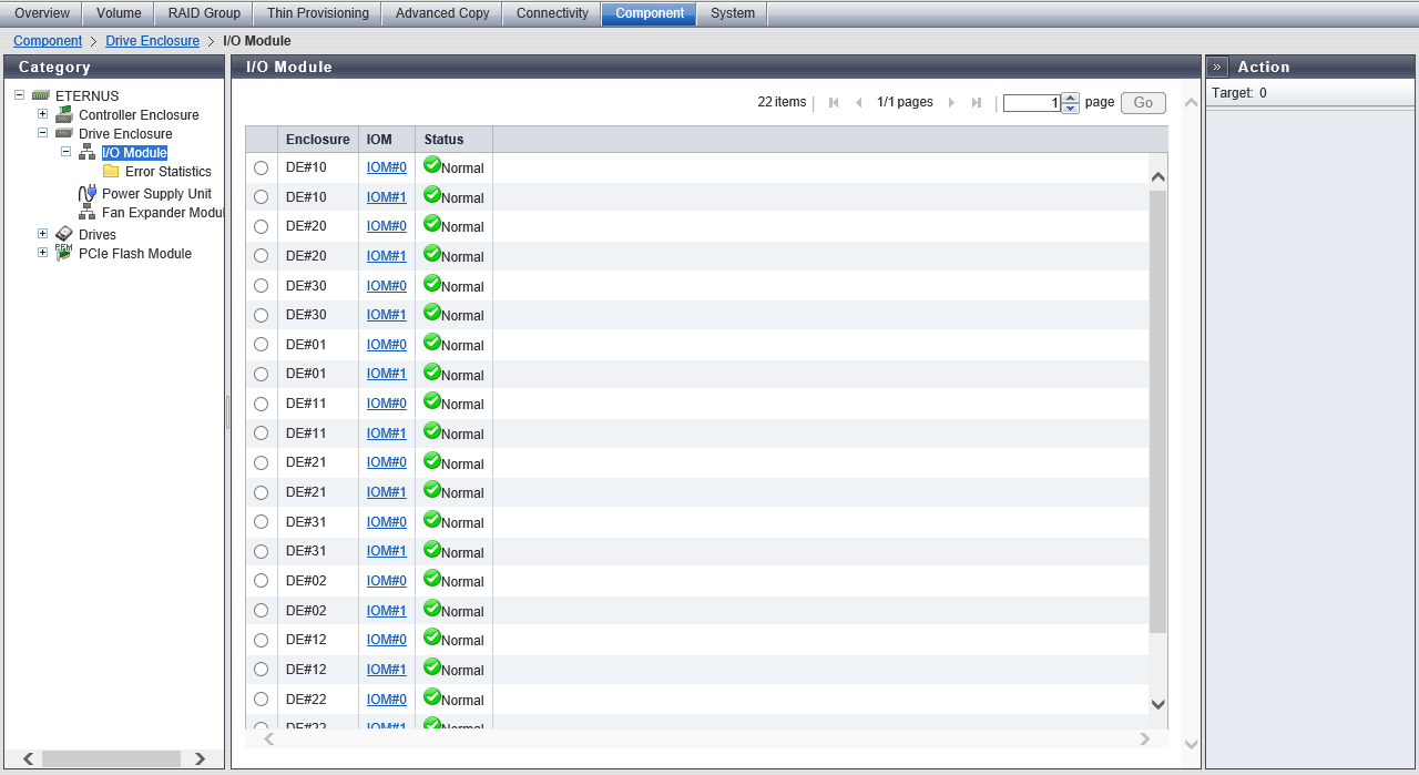 The internal parts of the IOM are displayed. A link is displayed when the part is "SAS Cable". Click this item to display the [SAS Cable Detail] Screen. When the part is a high density DE, "IOM FEM Port#y" (y: 0, 1) is displayed. SAS Cable (IN) SAS Cable (OUT) IOM FEM Port#y (y: 0, 1) |