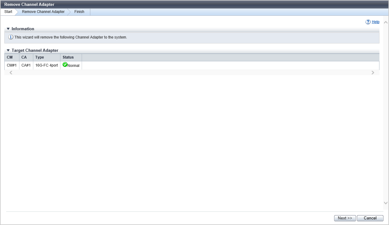 For 1CM model, the [Finish] screen is displayed without executing isolation of the CM. Remove the CA according to the displayed procedure. (For the ETERNUS DX100 S5/DX200 S5)