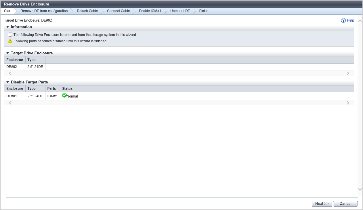 Remove the relevant DE from the storage system according to the displayed workflow and click the [Next >>] button.