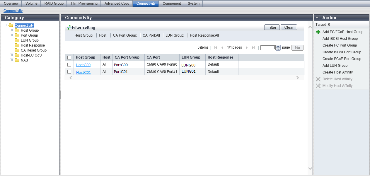 | LUN Group | LUN Group | The list of LUN groups that comprise a unit to enable hosts to recognize volumes is displayed. | ||