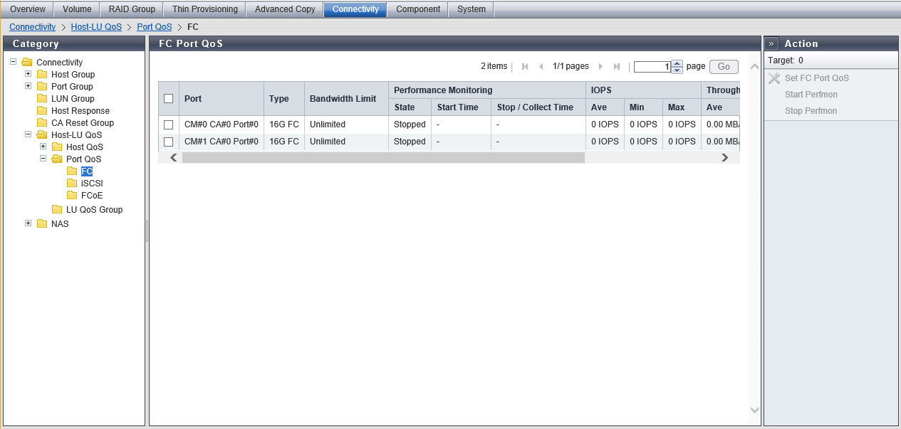 In this screen, the bandwidth limit and the performance information of the FC port are displayed.