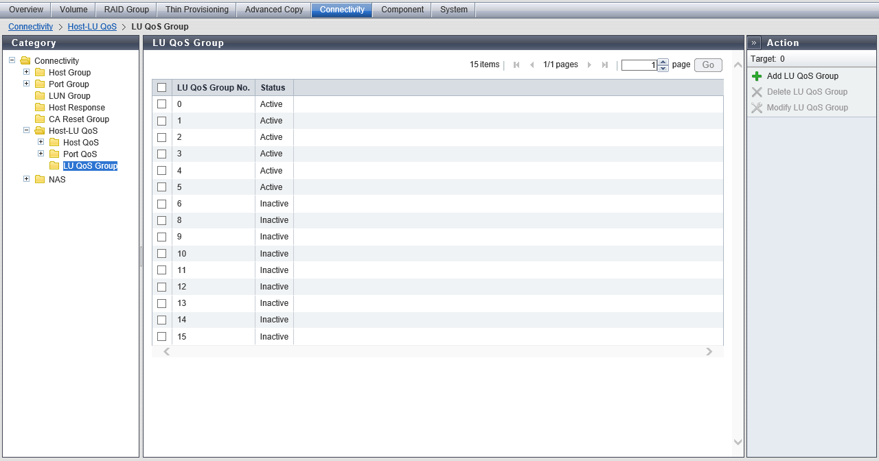 Assigning an LU QoS group to a LUN group with the host affinity set, the bandwidth limit can be configured for each host LUN. Refer to the [Set Host-LU QoS] function for details.