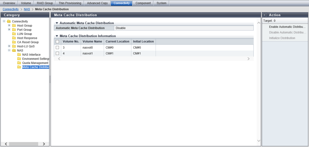 Whether the automatic meta cache distribution is enabled or not is displayed. If this item is "Enable", the meta cache distribution is checked for all registered NAS volumes in the storage system for the times described below. If "Current Location" and "Initial Location" do not match, a redistribution is performed.