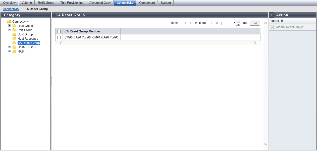 The location information of member ports of each CA reset group is displayed. For the ETERNUS DX900 S5 or the ETERNUS DX8900 S4 CE#x CM#y CA#z Port#w For the other models CM#y CA#z Port#w x: CE number y: CM number z: CA number w: Port number |