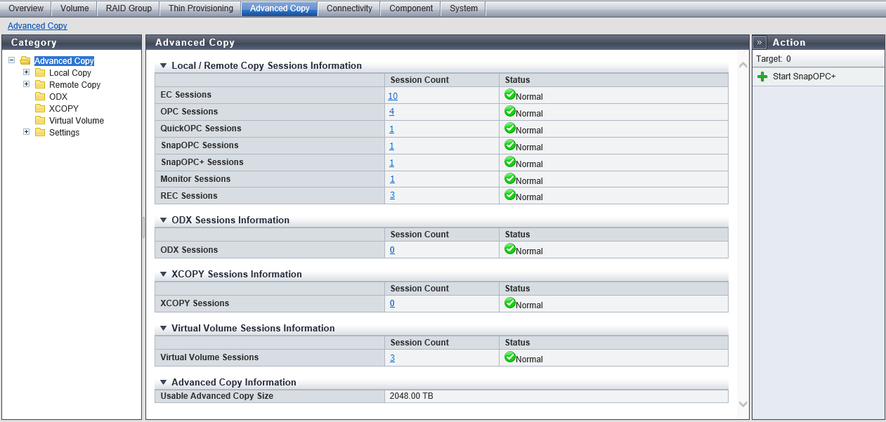 To display the Local / Remote Copy Sessions Information and Advanced Copy Information, register the Advanced Copy license. Note that the Remote Copy Sessions Information and Remote Copy related categories (copy path, REC Buffer, and REC Disk Buffer) are displayed only when using a model that supports REC.