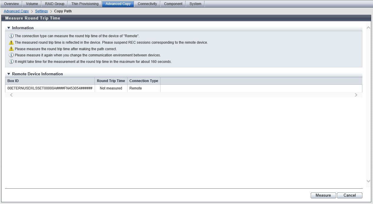*1 : The Storage Cluster function license must be registered using ETERNUS SF Storage Cruiser. Round trip time can be measured only when the connection type is "Remote". Round trip time cannot be measured when the connection type is "Direct".