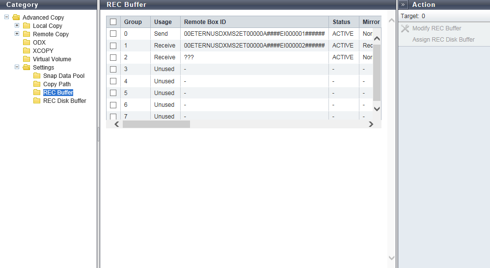 The Box ID for the remote storage system is displayed. If the copy path information is deleted after the REC Buffer creation, "???" is displayed. Note that REC Buffers with "???" cannot be used. Delete any REC Buffers with this status. Refer to the [Modify REC Buffer] function for details. A "-" (hyphen) is displayed when the usage is "Unused". |