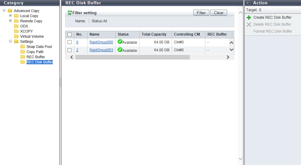 The RAID group number and the RAID group name of the REC Disk Buffer are displayed.