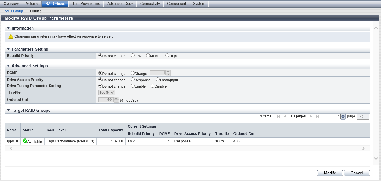 CautionThe response performance to the server may be affected by changing RAID group parameters.