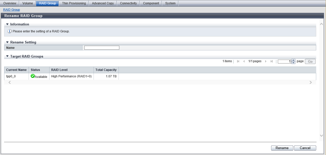Select the RAID group to be renamed (multiple selections can be made) and click [Rename] in [Action].