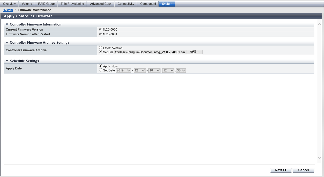 Select the controller firmware archive that is to be applied and the application date, and then click the [Next >>] button.