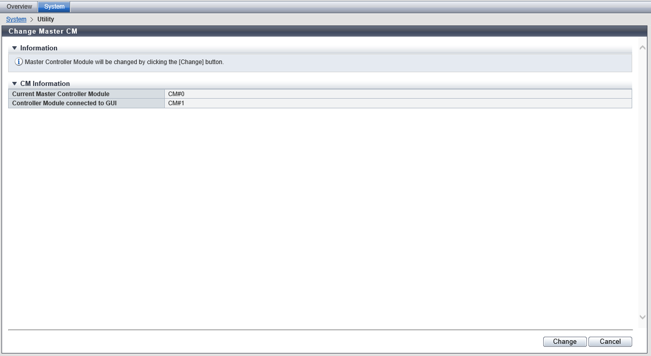 The CM that is logged in with Web GUI (Slave CM) is displayed. The displayed CM changes to the Master CM. For the ETERNUS DX900 S5 or the ETERNUS DX8900 S4 CE#x CM#y For the other models CM#y x: CE number y: CM number |