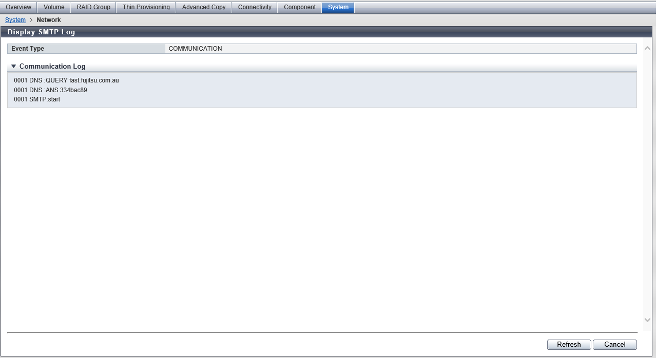 The E-Mail communication log contains requests from the storage system to the server and responses from the server to the storage system. Only the E-Mail communication log for the last executed event is displayed.
