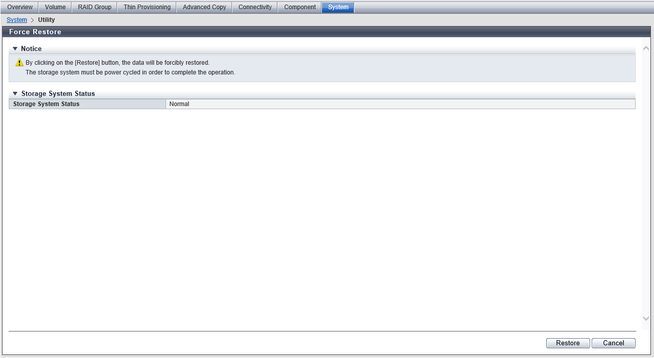 CautionDo not use this function unless the storage system status is "Restore Fail", or "Not Ready".