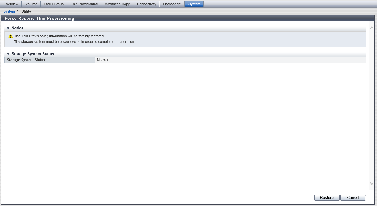 Do not use this function when the Thin Provisioning function is operating normally. If this function is used while operating, operation, the Thin Provisioning control table in the memory is overwritten with the backed up control table.