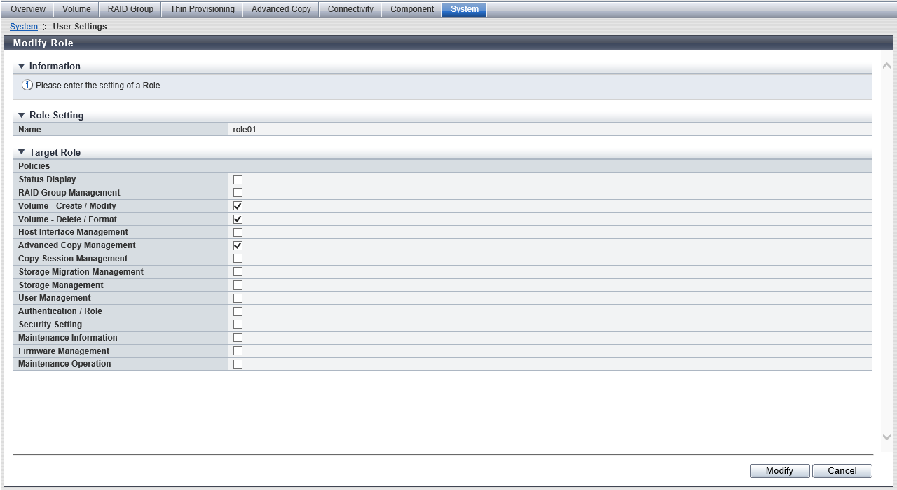 Select the role that is to be modified, and click [Modify Role] in [Action].