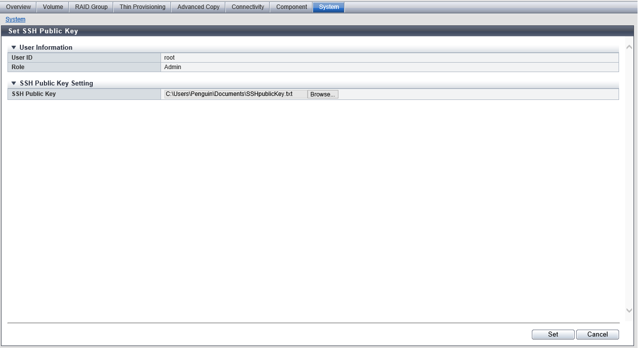 Register or change the SSH client public key used for login authentication from CLI in the storage system. Click the [Browse...] button and specify the public key to be registered or to be changed. When using the SSH client key authentication, register the SSH public key in the storage system and prepare the SSH secret key, corresponding to the public key in the client PC in advance. |