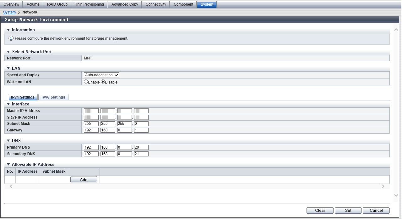 For "Allowable IP Address", specify the IP address or the network address that is allowed to access to the storage system. These settings are not required for access from the network address (same subnetwork) which the storage system belongs to.