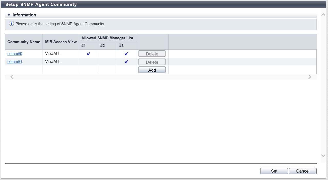 This function must be used when using SNMPv1 or SNMPv2c in SNMP communication between the SNMP Agent and the SNMP Manager. This setting is not necessary when using SNMPv3 only.