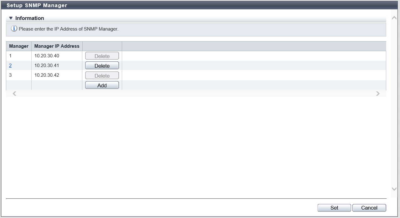 NoteTo delete the existing Manager IP address, click the [Delete] button for the target IP address.