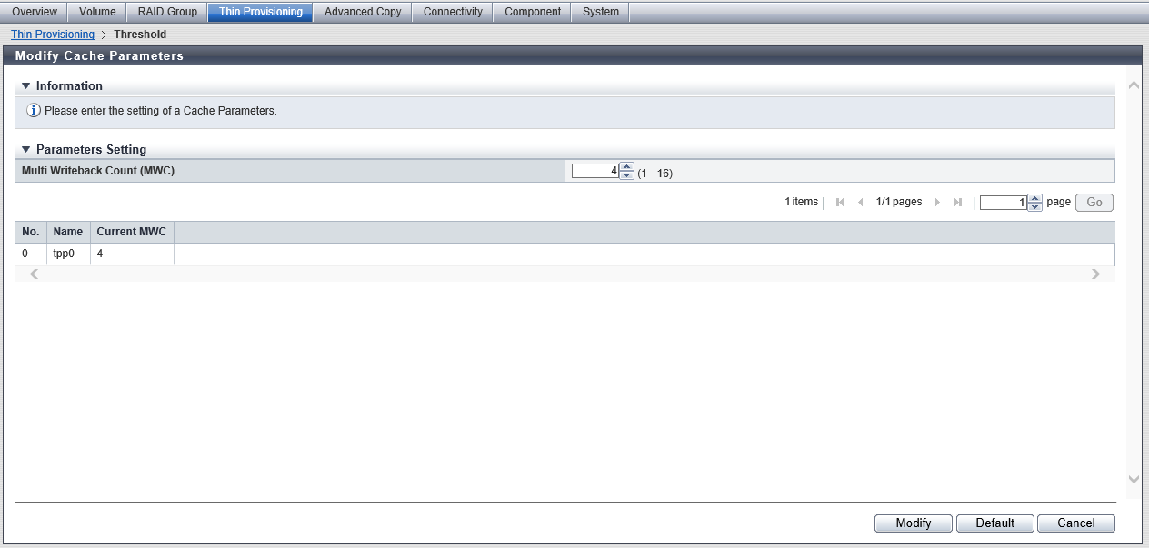 NoteIf the [Default] button is clicked before the [Modify] button, the default cache parameters are restored.