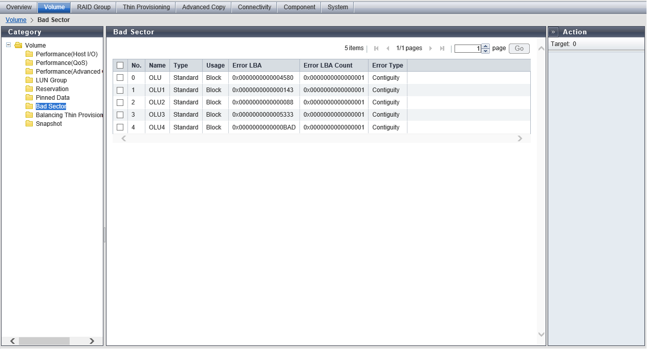 When a system message that indicates the detection of bad sector is displayed in the [Overview] screen, or when a "Bad data" event is notified by Host Sense Key Code Qualifier or SNMP Trap, use this function to check the detected bad sector.