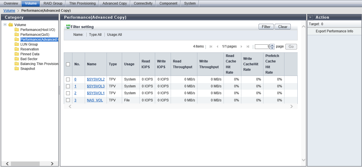 In this screen, the performance information of the volumes for Advanced Copy is displayed. When the performance monitoring function is stopped, "0" is displayed as the performance information.