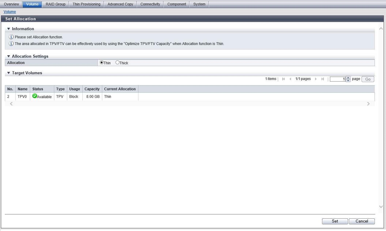 Select which volume to change the allocation method for (multiple selections can be made) and click [Set Allocation] in [Action].