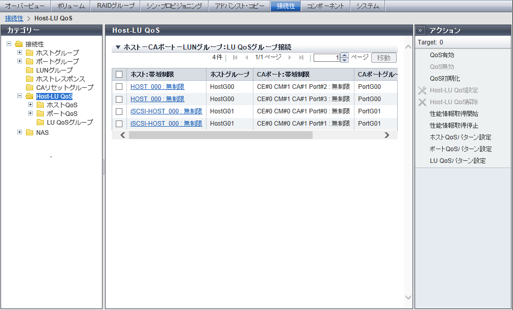 Host-LU QoS一覧では「ホスト」、「CAポート」、および「LUNグループ」間の関連付け、帯域制限(性能の上限値)、および性能情報を確認できます。