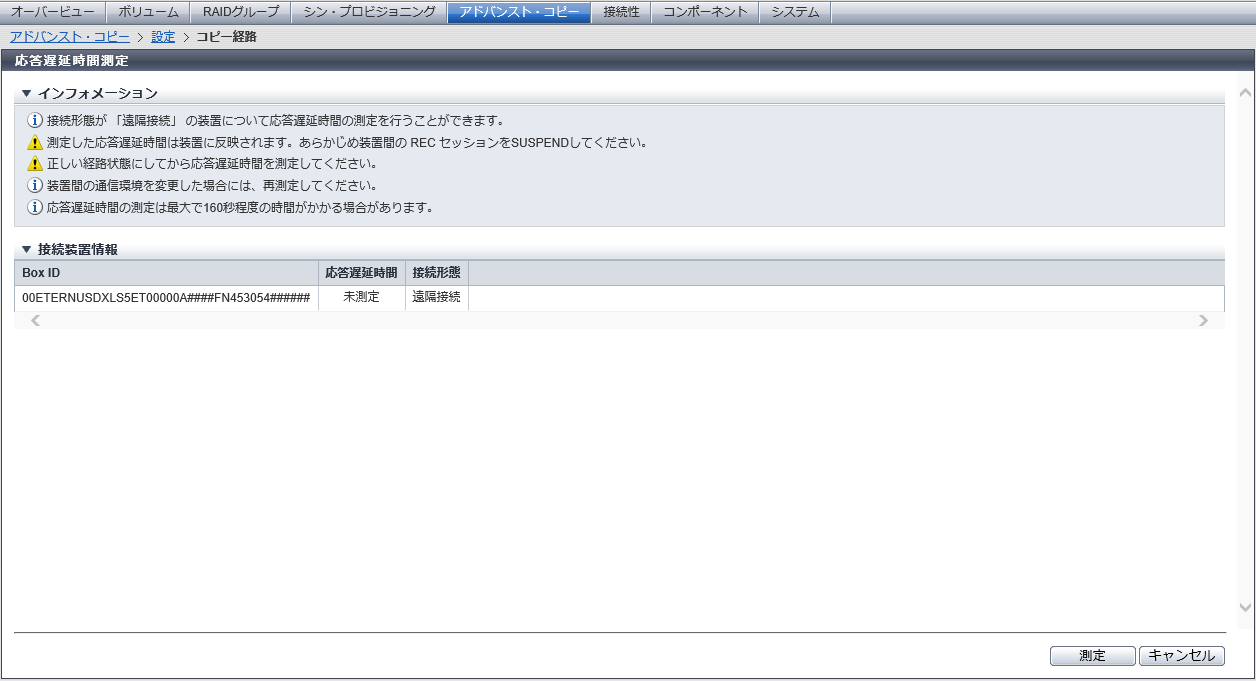 応答遅延時間は、コピー元装置およびコピー先装置の両方で設定が必要です。コピー元装置およびコピー先装置にコピー経路情報を適用後、応答遅延時間を測定し、結果(測定値)を設定してください。