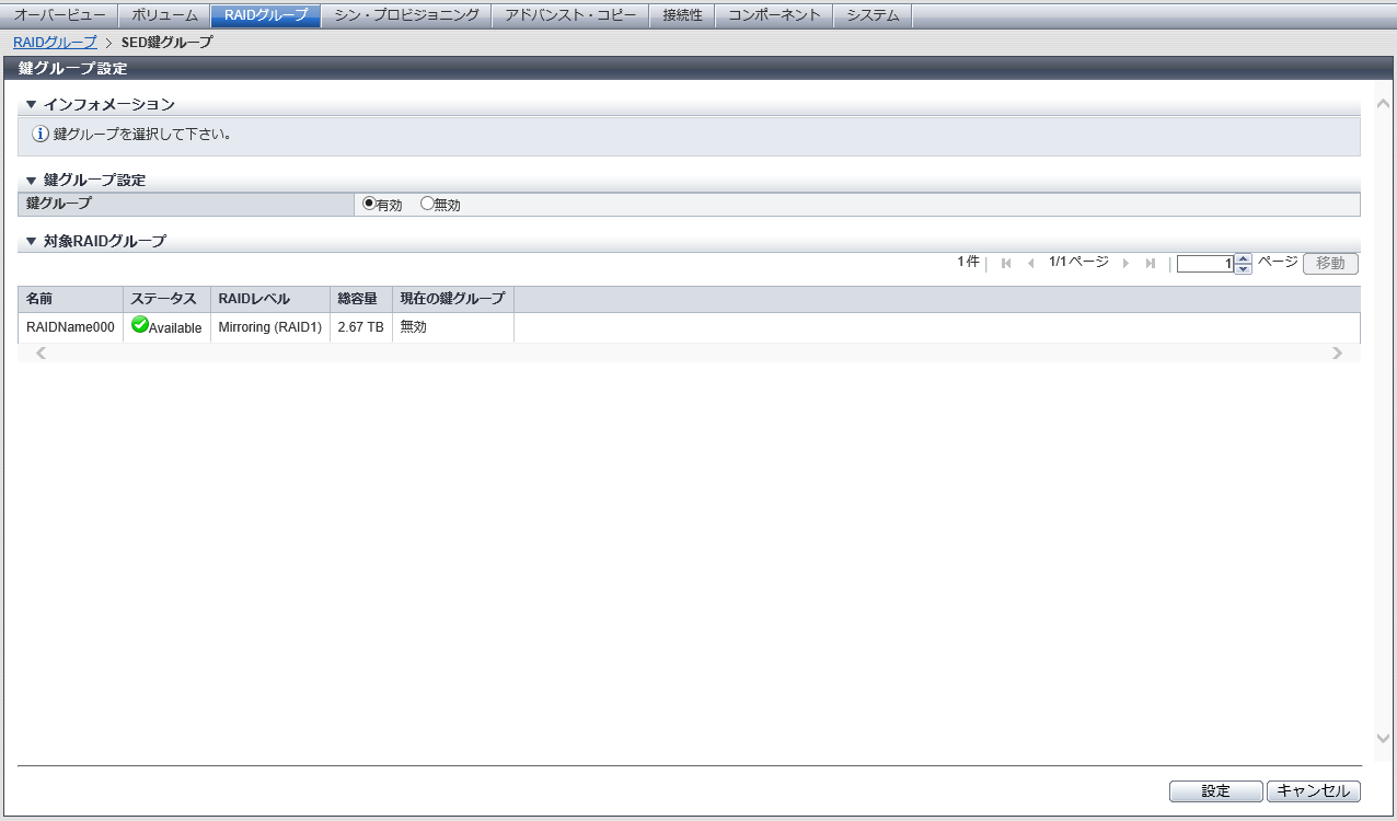 鍵グループにRAIDグループを追加する場合は「有効」を選択します。 鍵グループからRAIDグループを削除する場合は「無効」を選択します。 複数のRAIDグループを選択して本機能を起動した場合、一括で有効/無効を設定できます。 |