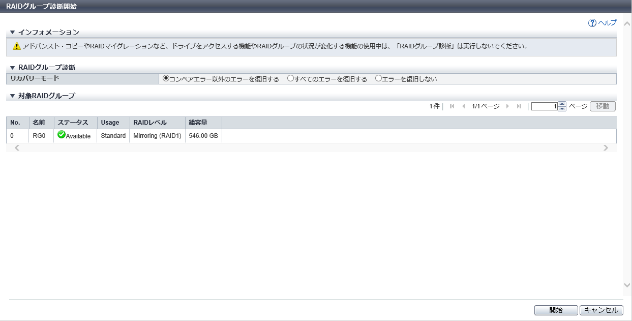注意- 以下のRAIDグループを選択した場合、「診断開始」をクリックできません。
