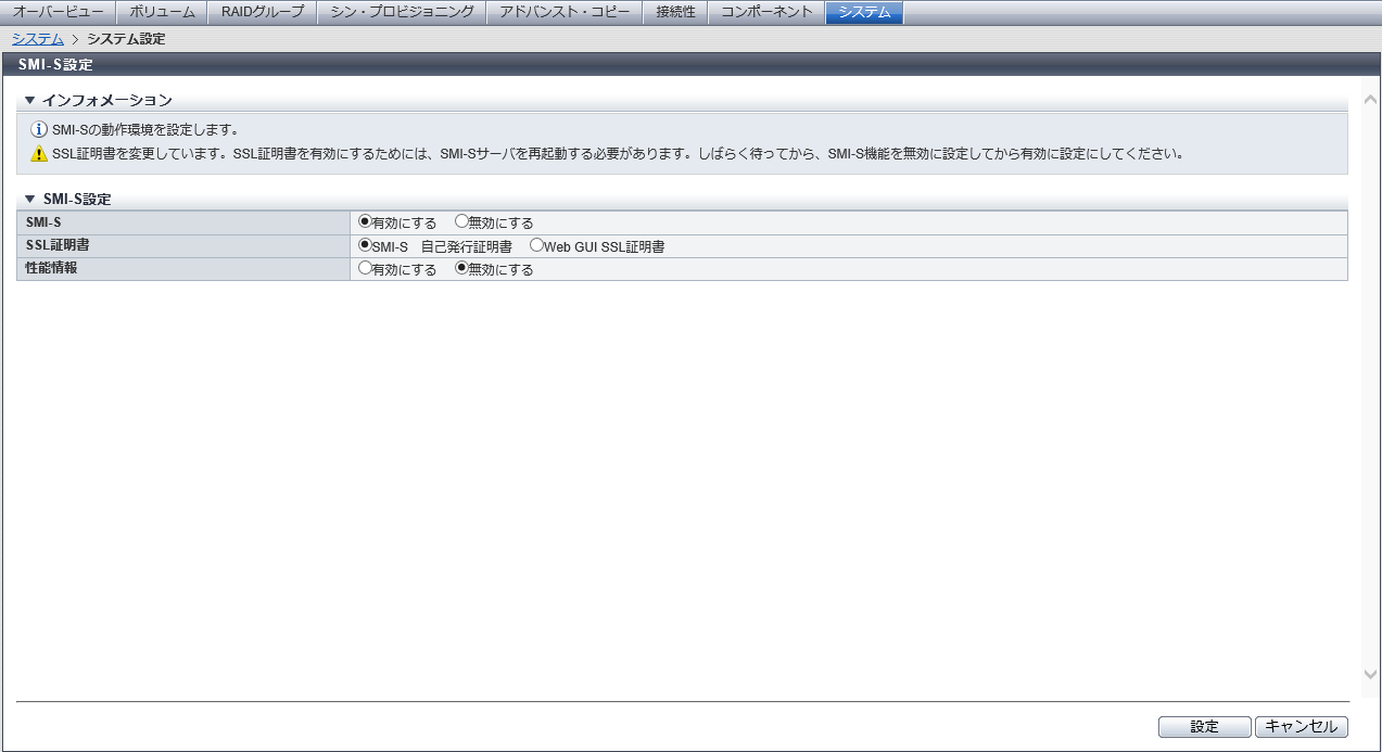 SMI-Sの有効設定中または無効設定中の場合、「SMI-S設定」のアクションはクリックできません。