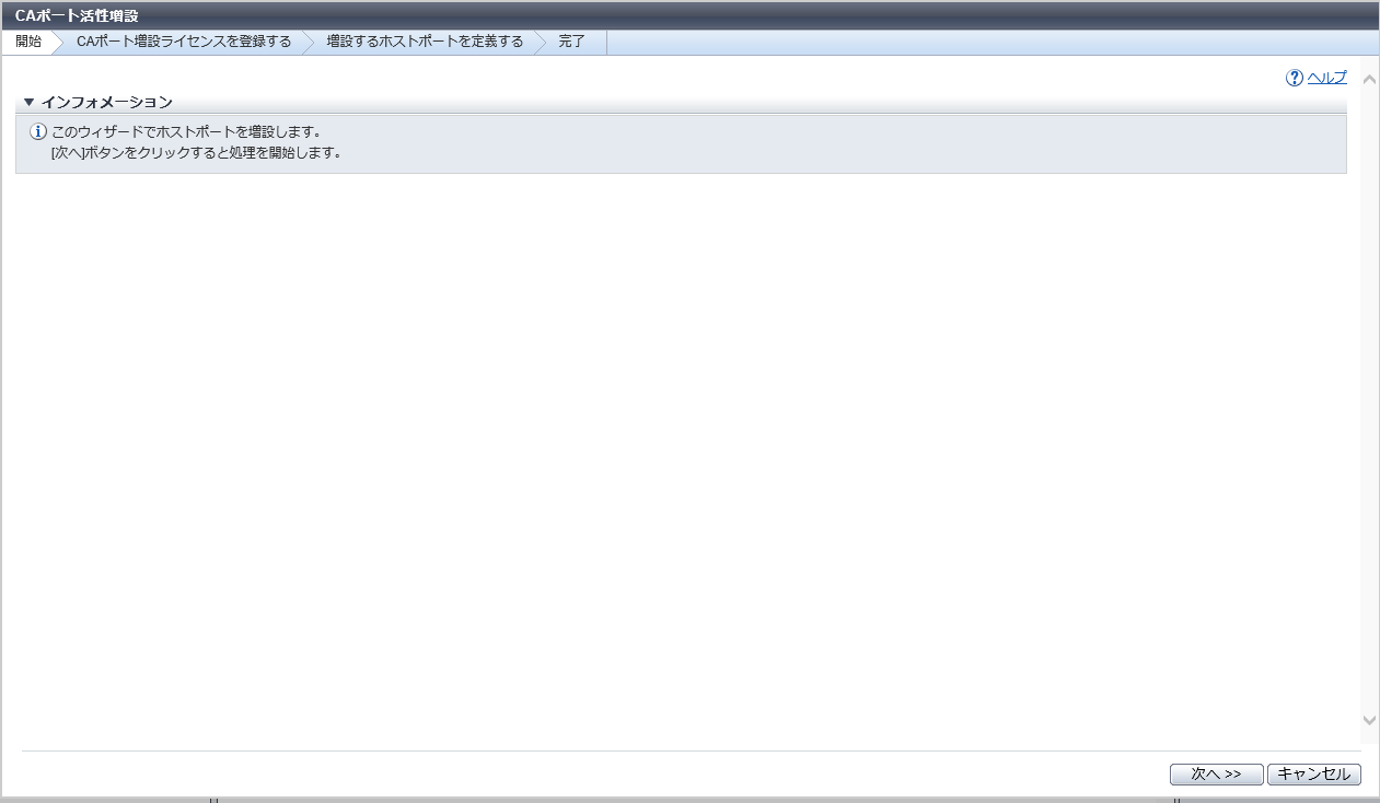 本機能は、ETERNUS DX60 S5/DX100 S5 に最少ポートタイプのCAが存在する場合だけ実行できます。各ホストインターフェースの最少ポートタイプごとに存在するライセンスキーを入力してポートを増設します。