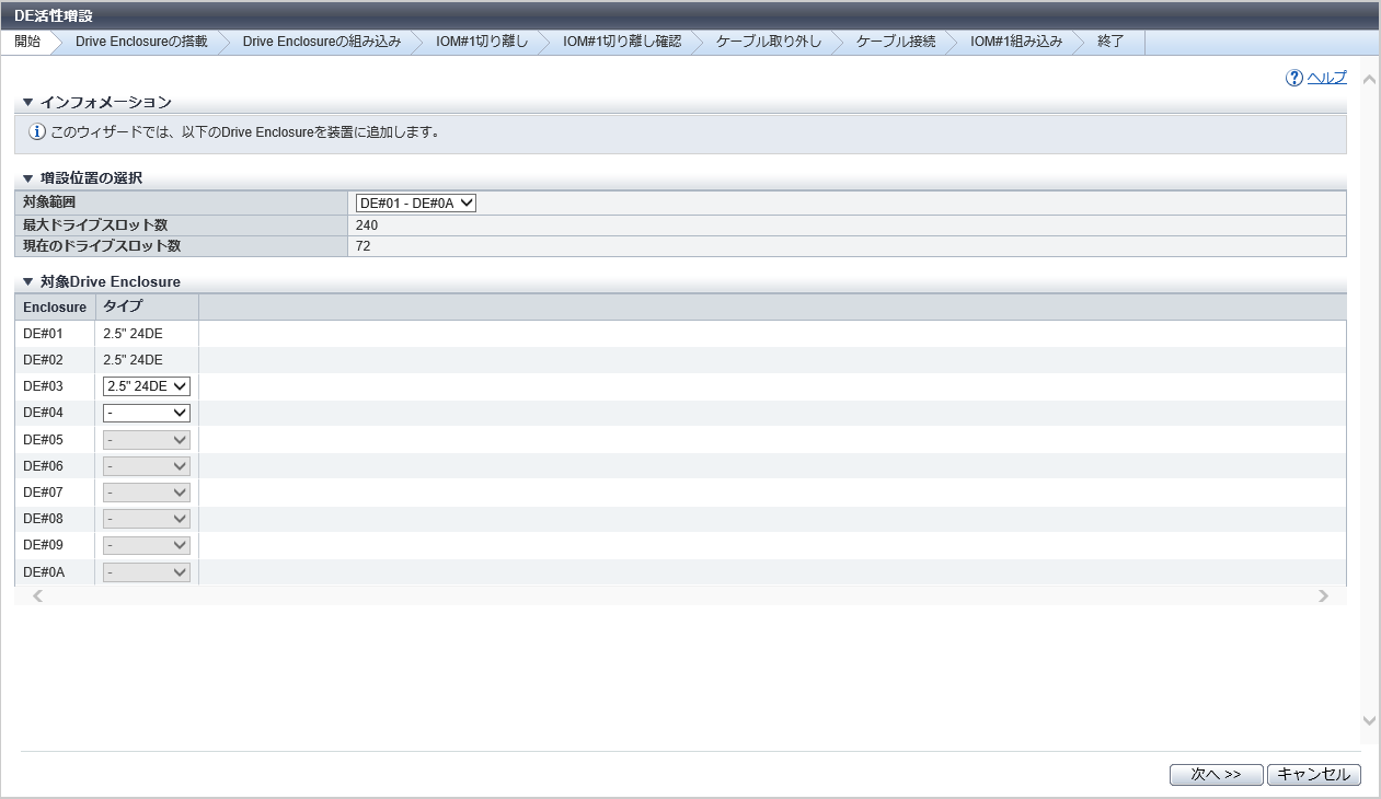 増設するDEの範囲を選択します。リストボックスには、一度の操作で増設できるDEの範囲が表示されます。 本項目は、ETERNUS DX500 S5/DX600 S5/DX900 S5、ETERNUS DX8100 S4/DX8900 S4、およびETERNUS AF650 S3の場合に表示されます。 |