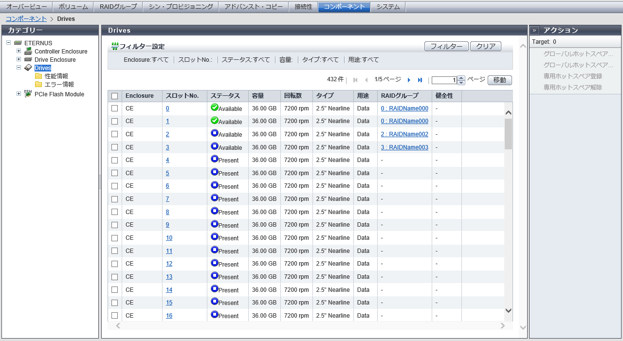 ドライブが搭載されているエンクロージャのスロット番号が表示されます。 クリックすると、[ ドライブ詳細 ] 画面が表示されます。 2.5インチ用CE/DE:0 ~ 23 3.5インチ用CE/DE:0 ~ 11 3.5インチ用高密度DE:0 ~ 59 |