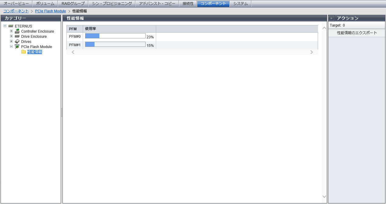 性能情報取得が開始した場合、PFMの使用率(0 ~ 100 %)がバーと数値で表示されます。 性能情報取得が停止した場合、使用率は「0 %」で表示されます。 |